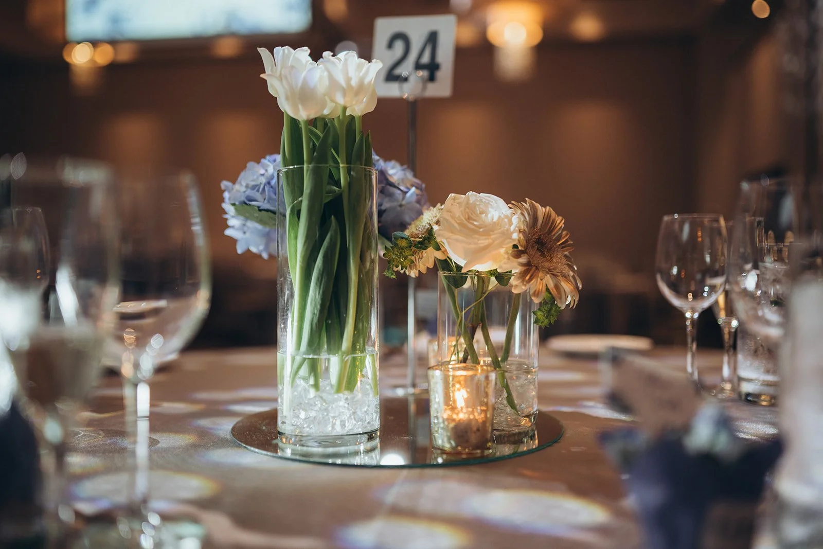 Michelle and Mathias' wedding at the Guild Inn Estate is a dream for blue enthusiasts. The natural beauty and historic charm of the venue set the stage for a timeless celebration, enhanced by light blue hydrangeas and white tulips at the reception, creating an atmosphere of soft, romantic elegance. A symbolic touch is added with small potted plants doubling as name cards, embodying the enduring and growing nature of the couple's love.